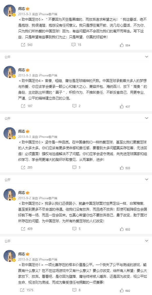 之后阎志在微博连发5条“致中国足协”,有些内容在今天看来也值得中国足球思考。
