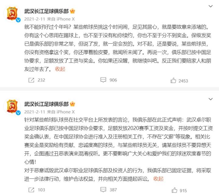 2021年年初,周通、刘毅、江子磊在微博发文讨薪,随后武汉队官方回应“已足额发放202赛季工资奖金,不存在欠薪”,之后姚翰林、刘云等多位武汉队队员也发声表示不存在欠薪。这件事最终也就不了了之。