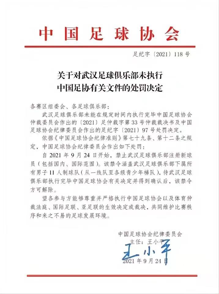 在2022赛季初,武汉队就因为多起仲裁案件而被禁止注册新球员,当时武汉长江向足协发函申请暂缓转会禁令,并给出解决欠薪问题的承诺,如果未履行承诺,愿意接受相关处罚。其中就包括,本赛季初引进的队员,在处罚期内不被允许参赛,直到处罚结束。