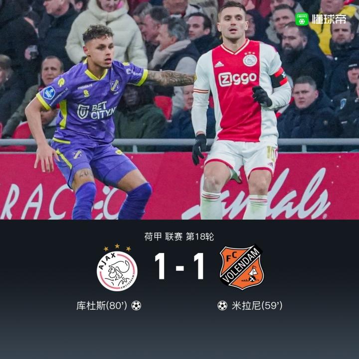 阿贾克斯1-1福伦丹遭遇联赛六连平+七轮不胜,库杜斯替补救主