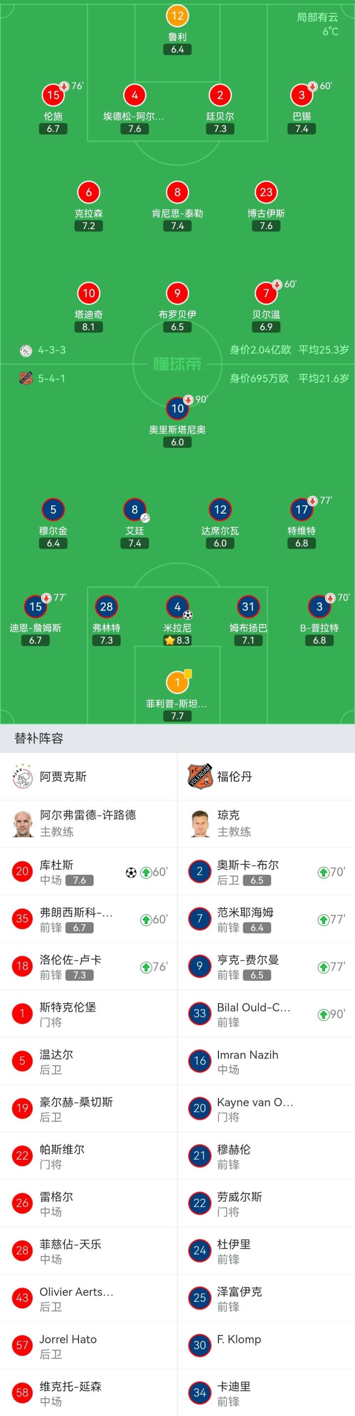 阿贾克斯首发:12-鲁利、15-伦施(76'18-洛伦佐-卢卡)、4-埃德松-阿尔瓦雷斯、2-廷贝尔、3-巴锡(60'35-弗朗西斯科-孔塞桑)、23-博古伊斯、6-克拉森、8-肯尼思-泰勒、10-塔迪奇、9-布罗贝伊、7-贝尔温(60'20-库杜斯)