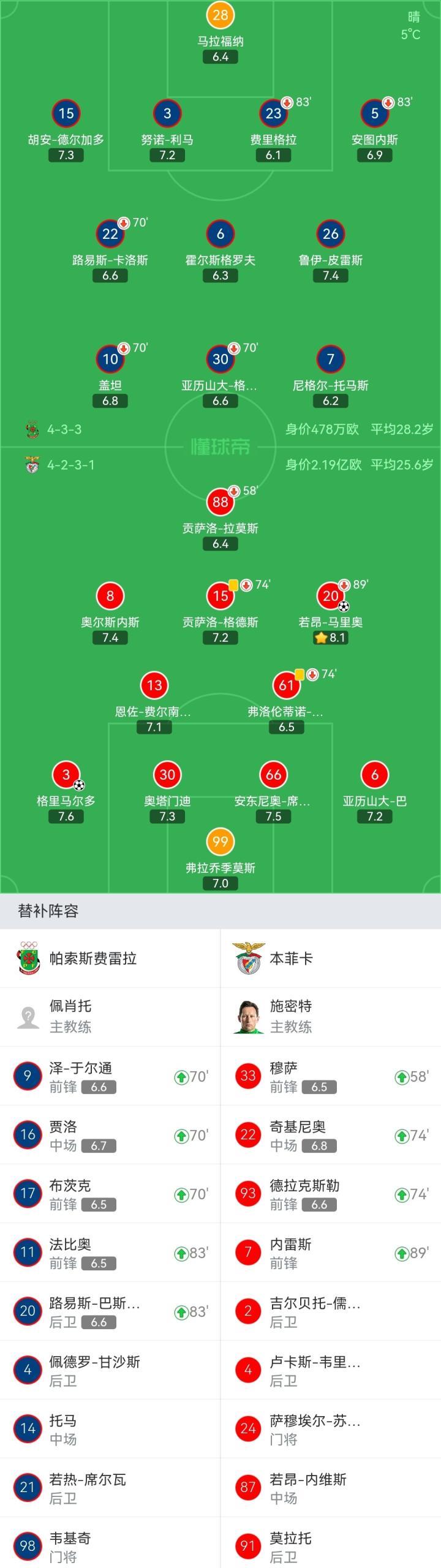本菲卡首发:99-弗拉乔季莫斯、3-格里马尔多、30-奥塔门迪、66-安东尼奥-席尔瓦、6-亚历山大-巴、61-弗洛伦蒂诺-路易斯(74'22-奇基尼奥)、13-恩佐-费尔南德斯、8-奥尔斯内斯、15-贡萨洛-格德斯(74'93-德拉克斯勒)、20-若昂-马里奥(89'7-内雷斯)、88-贡萨洛-拉莫斯(58'33-穆萨)