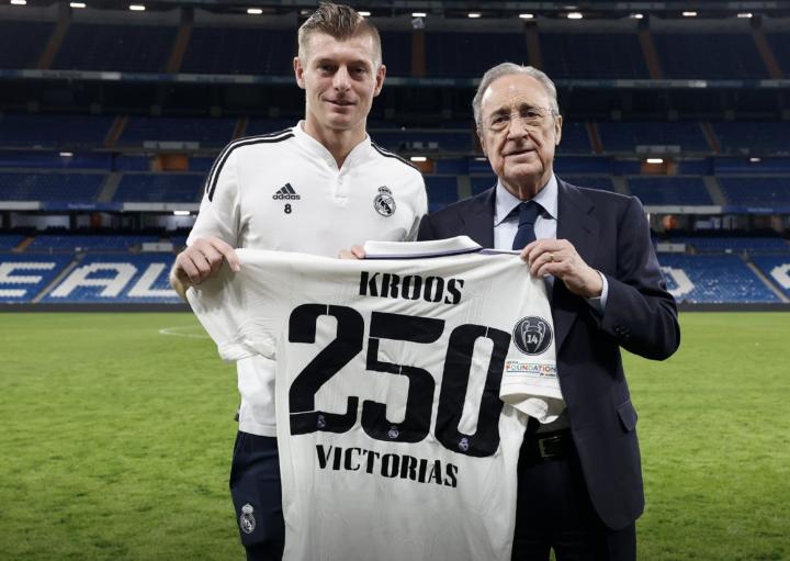 国王杯四分之一决赛皇马3-1战胜马竞,此役对于克罗斯意义非凡,是他加盟皇马以来,个人取得的250场胜利。赛后皇马主席弗洛伦蒂诺也赠予了他250场胜利的纪念球衣。