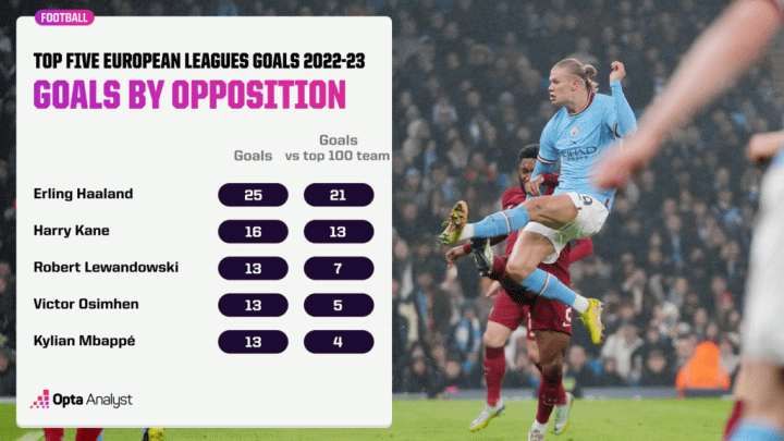 实力排名系统为我们提供了一种量化游戏中对手实力的新方法。我们可以看看欧洲五大联赛目前的最佳射手的进球数,并比较他们在对阵顶级球队时的进球数比例。