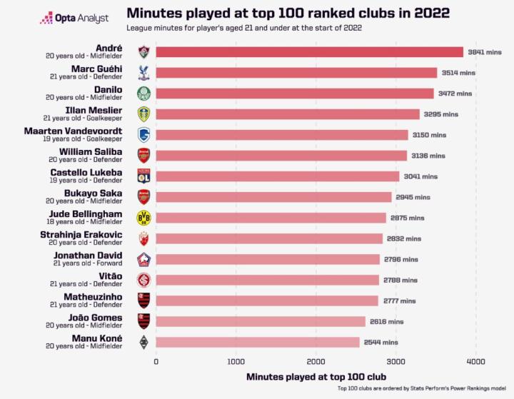我们对在目前排名世界前100的球队中,在2022年出场时间最多的年轻球员进行排名。现在转会市场上出现了很多备受追捧的球员,所以感觉球队正在做一些正确的事情。这些例子只是我们用实力排名系统所能分析的内容的皮毛。
