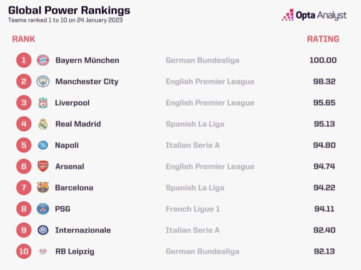 截至2023年1月24日,最新的实力排名将拜仁慕尼黑列为世界上最好的球队。每支球队的排名都是相对于第一名拜仁的100分进行排名,曼城紧随其后。