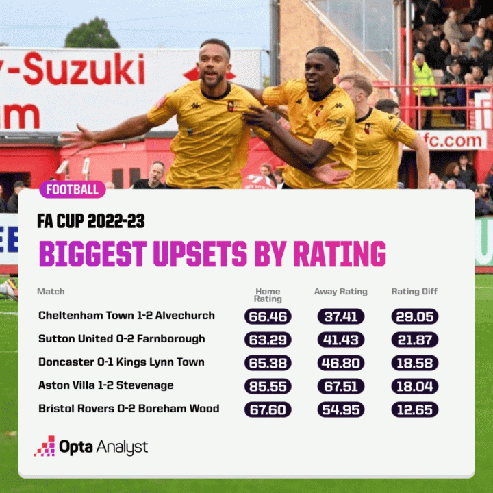 位于伍斯特郡的南部超级联赛中部赛区的球队阿尔夫彻奇在11月初客场2-1战胜了英甲球队切尔滕纳姆城,这是统计榜列出的最大冷门。