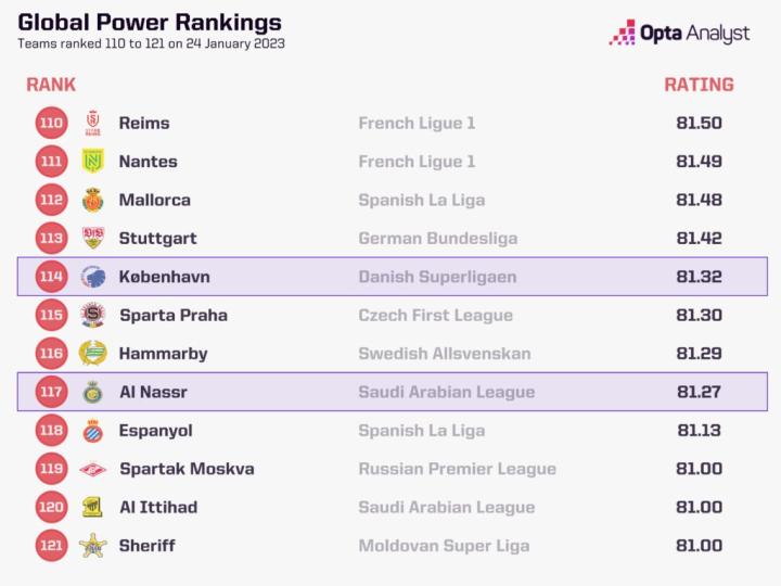 在对近13500支球队进行排名时,总会有一些复杂和细微的差别。那些没有降级的联赛、联赛内的统计异常值、国内杯赛和新比赛都是我们不断更新模型的新障碍。利雅得胜利或许不会与曼联进行比赛,但就目前而言,这是比较他们水平的最有效方式。