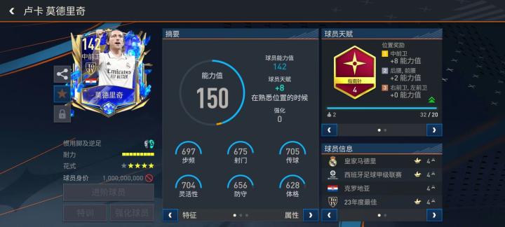 ○ 花式方面,莫德里奇配备了马赛回旋,结合4星花式星级,在持球进攻方面魔笛表现上佳。