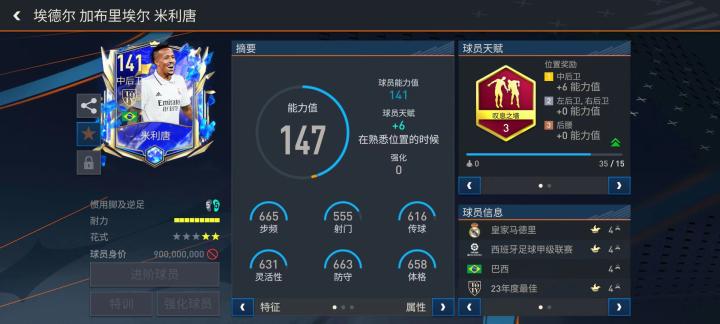 游戏中,米利唐推出的这张年度最佳球员版本实力也比较出色。司职中后卫的米利唐配备了现阶段常见的后防至尊天赋叹息之墙,对他的加速、人盯人、铲断、拦截、侵略性五项数据提升显著。