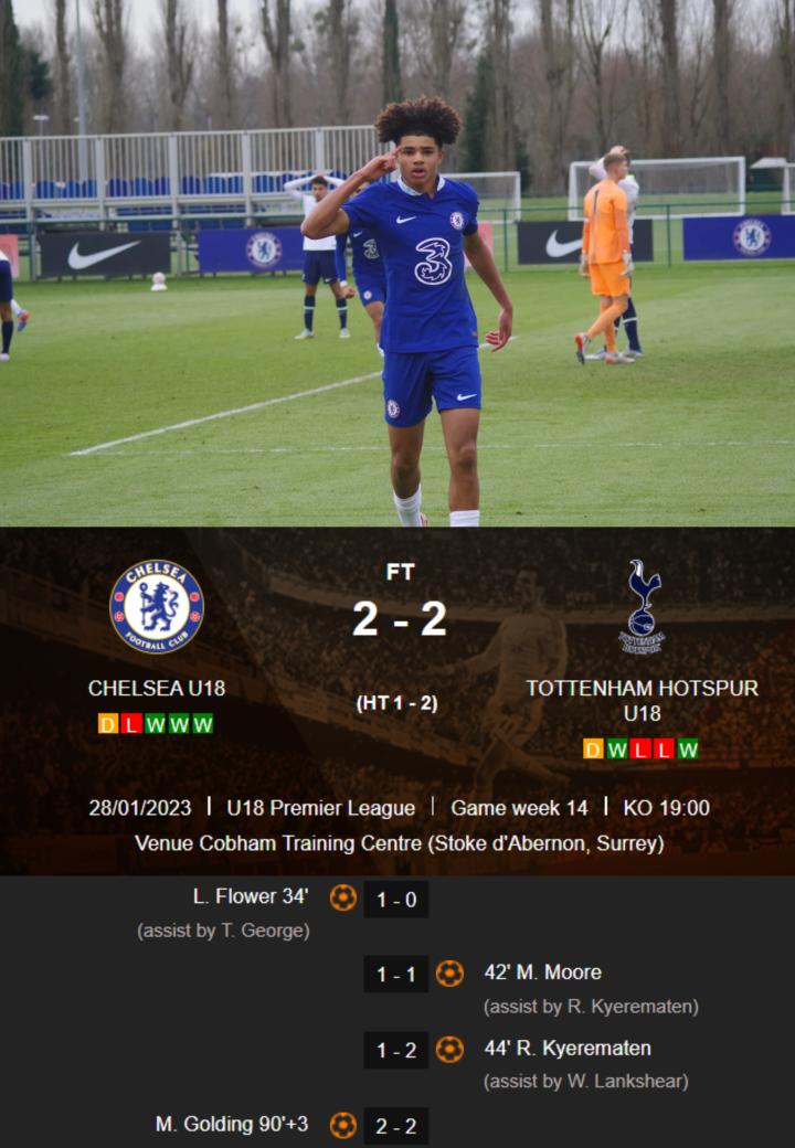 北京时间1月28日晚七点,U18英超联赛南区第14轮上演伦敦德比,切尔西主场2-2绝平热刺。上半场弗劳尔首开记录,半场结束前米奇-摩尔和基耶雷马滕为热刺连入两球;下半场戈尔丁为蓝军上演绝平。