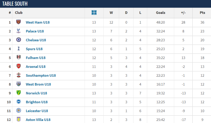 U18英超联赛南区即时积分榜:切尔西与热刺战平后分列二三位,双方差一分。