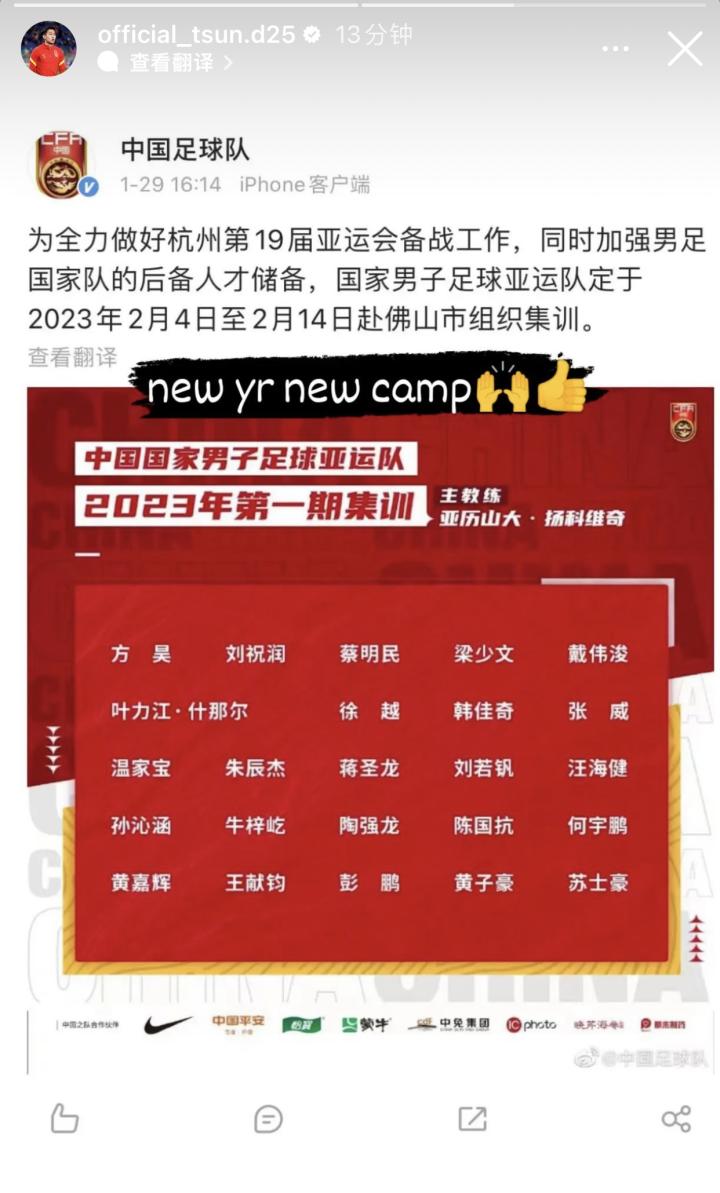 戴伟浚社媒发文:新年新任务! 莱斯特城的小狐狸 莱斯特城的小狐狸2023-01-29 17:331月29日,国足亚运队2023年第一期集训名单公布。入选名单的中国球员戴伟浚也在社交媒体发文表示:新年新任务!并配上大拇指表情。为备战杭州第19届亚运会,国足亚运队定于2023年2月4日至2月14日赴佛山市组织集训。展开更多
