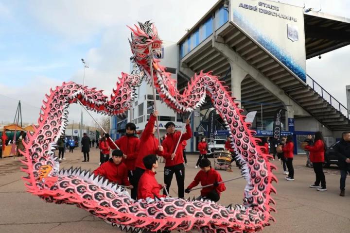 当天,阿贝·德尚体育场一派节日的景象。赛场内外挂满了红灯笼,贴了春联,剪纸福字和春字生肖图案。