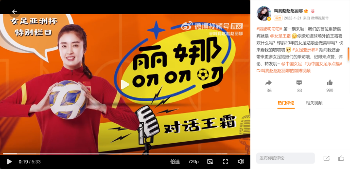 亚洲杯夺冠后,女足运动的社会关注度终于迎来转折。赛事期间,此前凭借出众的外形和气质而关注度颇高的门将赵丽娜,在社交媒体上开设了一档名为《丽娜叨叨叨》的对话栏目,并在此后保持着相对固定的更新频率。首期节目,赵丽娜对话中国女足头号球星王霜,在哔哩哔哩平台收获了38.6万次播放量。