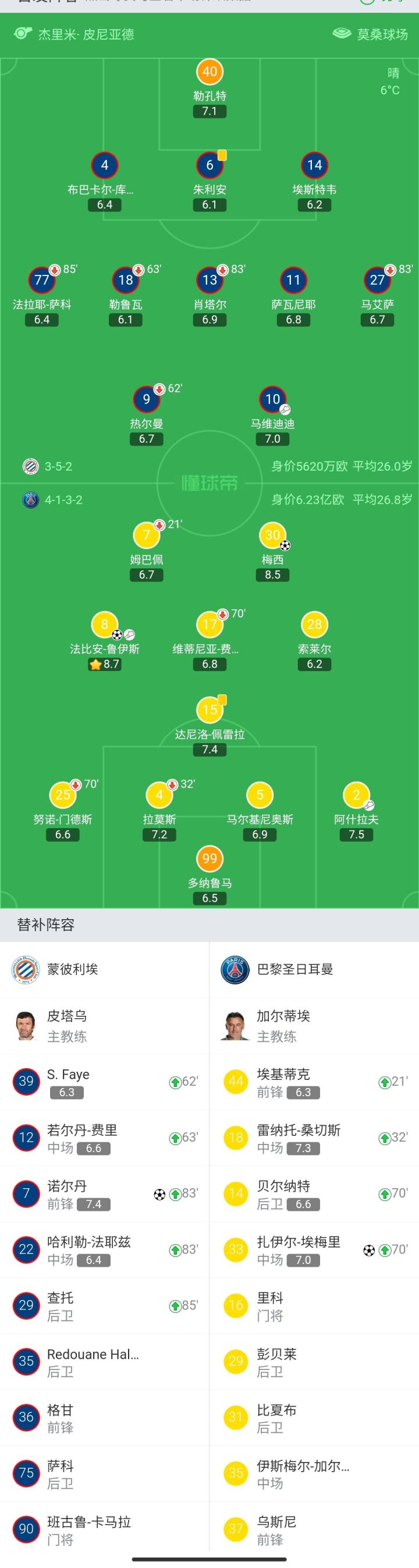 蒙彼利埃首发:40-勒孔特、4-库亚特、6-朱利安、14-埃斯特韦、11-萨瓦尼耶、27-马艾萨(85′22-法耶兹)、13-肖塔尔(83′7-诺尔丹)、77-法拉耶-萨科(85′29-查托)、18-勒鲁瓦(63′12-若尔丹-费里)、9-热尔曼(62′39-费耶)、10-马维迪迪