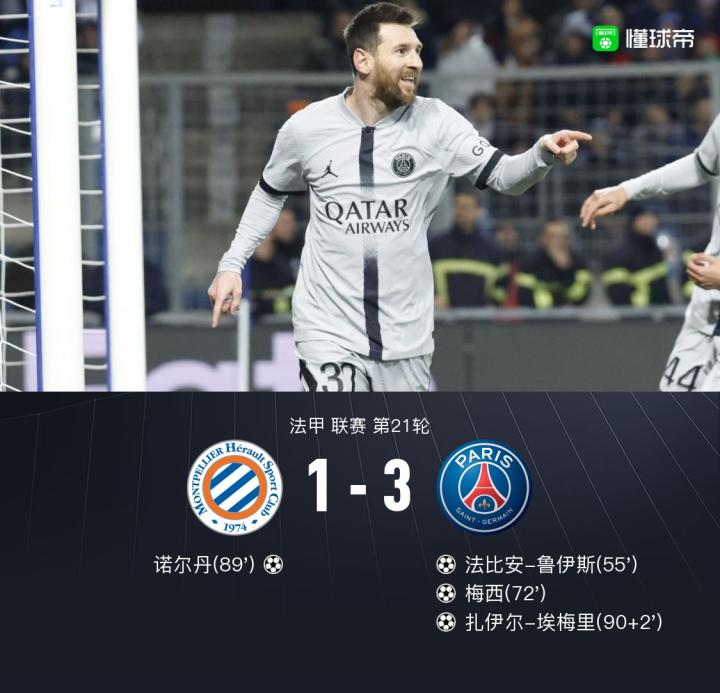 巴黎3-1蒙彼利埃,梅西、埃梅里破门,姆巴佩两失点+伤退