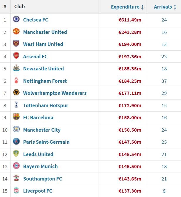 【本赛季引援花费排名:切尔西超6亿欧第一,曼联2.4亿第二】