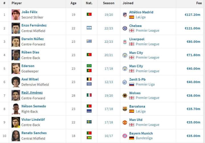【本菲卡出售球员转会费:菲利克斯1.27亿欧第一,恩佐第二】