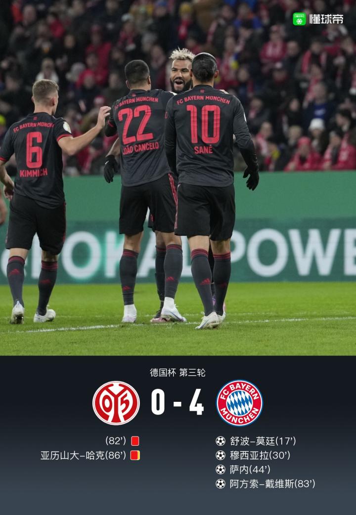 【德国杯拜仁4-0美因茨晋级,舒波-莫廷传射,坎塞洛首秀献助攻】