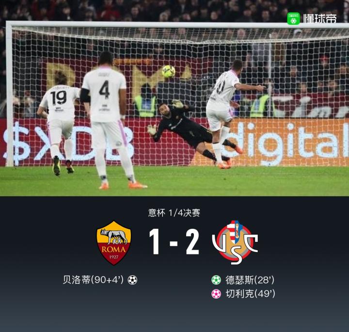 【意杯罗马1-2克雷莫内塞,亚伯拉罕失良机,贝洛蒂破门难救主】
