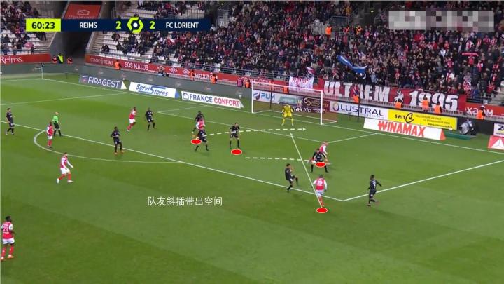 在兰斯,巴洛贡可以依靠球队整体在前场瞬间的提速,打对手后卫的落位差,获得空间。同时巴洛贡在侧翼的活动非常频繁,不光是能自己获得空间,同时也能给中路队友创造插上机会。
