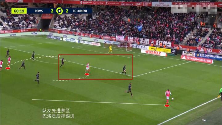 兰斯后场转移分边后,中路的巴洛贡先向回撤要位,中场的队友已经插上先进入禁区,吸引对方中卫。