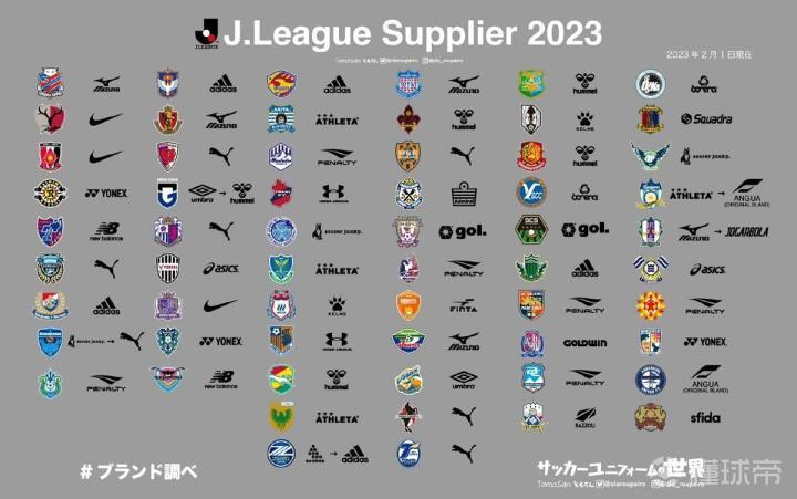 日本职业联赛球衣赞助商 2023赛季各队赞助商已经尘埃落定,只有少部分球队更换了赞助商。有意思的是,60支职业队阿迪耐克彪马三巨头只有14支占比不到25%四分之一。更多的球队选择了日本本土品牌如美津浓,penatly或者爱世克斯尤尼克斯等等。在我个人看来,阿迪这样的大品牌更容易用模板球衣哄弄球队,反而日本本土品牌更愿意通过球衣在球衣上展现球队所在地的文化以及与球迷之间的对话! 还值得关注的是,丹麦品牌hummel大黄蜂赞助球队多了起来,我个人很喜欢大黄蜂接地气的球衣设计,满满的地域元素撑起了球衣的有趣的灵魂,如果可以,请横滨水手尽快换hummel或者日本本土品牌!