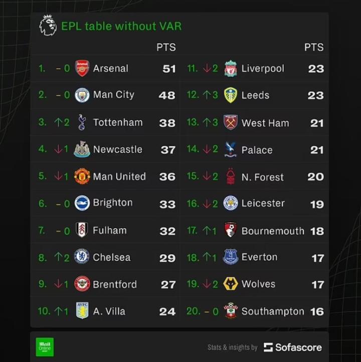22/23赛季 英超联赛无VAR积分榜