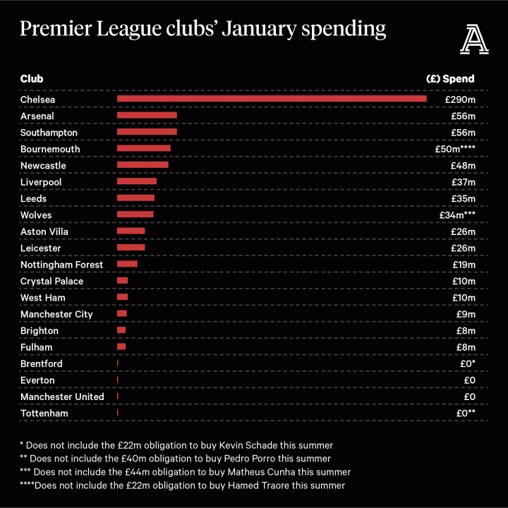 英超球队冬窗支出一览,切尔西2.9亿独占鳌头(租借球员的买断费用不计)