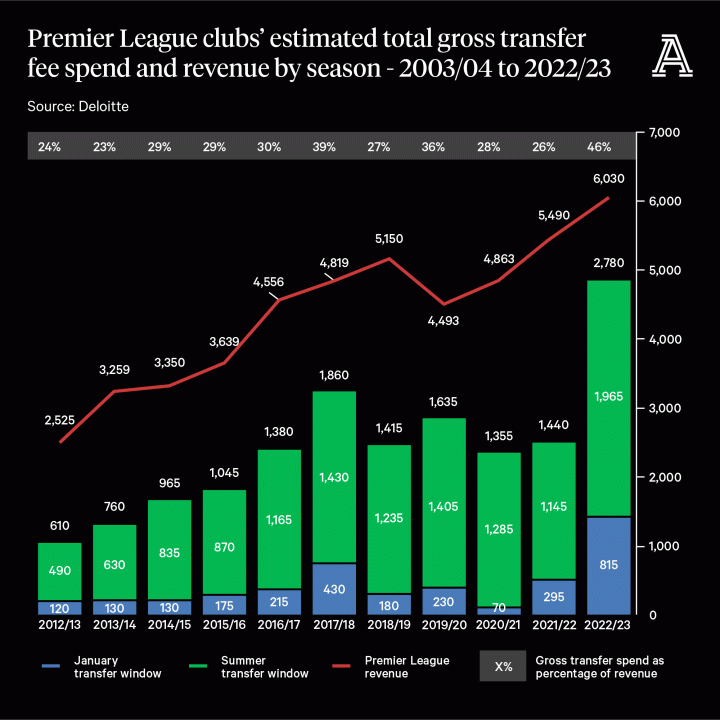 刚刚结束的冬季转会窗,可以被视作疯狂夏窗的续集。挥洒在冬窗的大笔支票,将英超联赛的总体支出提升到了一个难以逾越的高度。继去年夏窗豪掷19亿英镑后,今年冬窗,英超球队创造8.15亿英镑的惊人交易额,在压哨的最后24小时,就诞生了价值2.75亿英镑的交易。