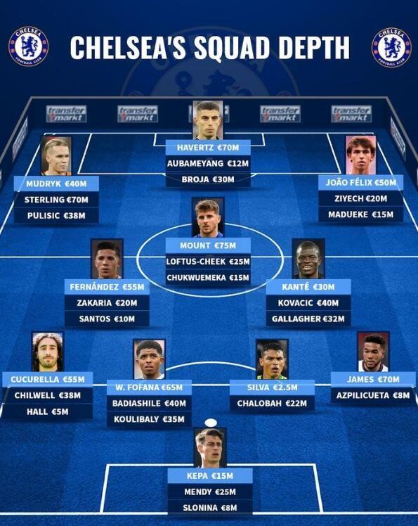在去年夏窗和今年冬窗,切尔西总计花费超过6亿欧元,签下了多名球员。德国知名足球数据网站“转会市场”列出了目前切尔西的阵容厚度,现在切尔西差不多可以排出三套实力出众的阵容。