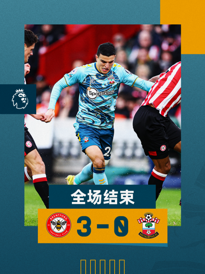全场比赛结束|布伦特福德 3-0 南安普顿 最终我徒在客场不敌布伦特福德