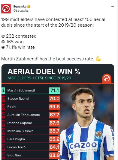 从2019-20赛季到现在,在199名参加过至少150次空中对抗的中场球员中,苏维门迪的成功率最高。他的成功率超过70%,这证明他的空中优势比罗德里、博格巴和楚阿梅尼等同位置大牌球员更强。
