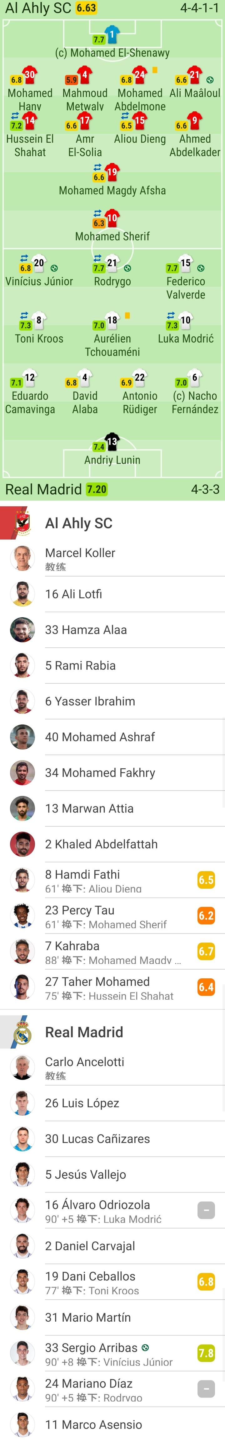 皇家马德里首发:13-卢宁、6-纳乔、4-阿拉巴、22-吕迪格、12-卡马文加、18-楚阿梅尼、8-托尼-克罗斯(77'19-塞瓦略斯)、10-莫德里奇(90+6'16-奥德里奥索拉)、15-费德里科-巴尔韦德、20-维尼修斯(90+8'33-阿里巴斯)、21-罗德里戈(90+6'24-马里亚诺-迪亚斯)