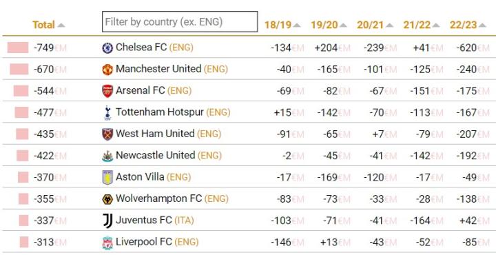 【CIES列近5个赛季净转会投入:切尔西7.49亿欧最多,曼联第二】