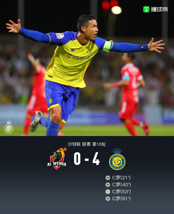 【利雅得胜利4-0麦加统一,C罗上演大四喜+开启运动战进球账户】
