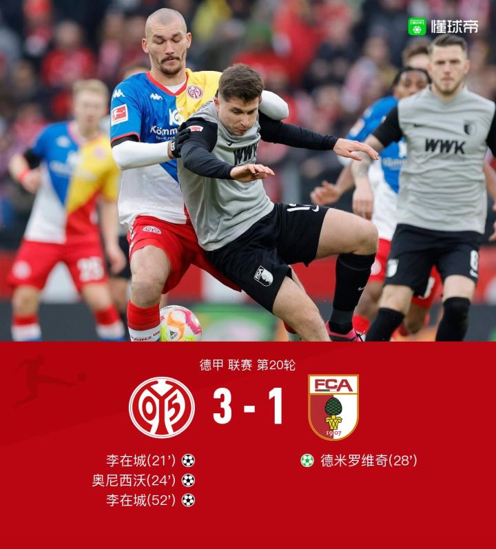 北京时间2月11日22:30,德甲第20轮比赛,美因茨对阵奥格斯堡。上半场,李在城抓住断球后反击机会破门,奥尼西沃再下一城,德米罗维奇扳回一城;下半场,李在城再次破门,延森进球越位被吹,最终美因茨3-1奥格斯堡。