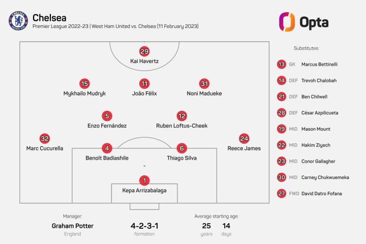 首秀染红禁赛后,本场面对西汉姆联,菲利克斯终于解禁复出。波特在先发阵容上拿下了芒特,用菲利克斯代替了前者的位置,同时继续坚持4231的阵型。“亿元先生”恩佐连线菲利克斯,上演“亿传亿射”,至少在上半场的前30分钟里,切尔西的进攻相比前几场是有起色的。