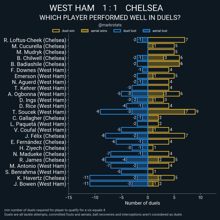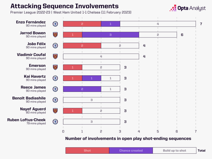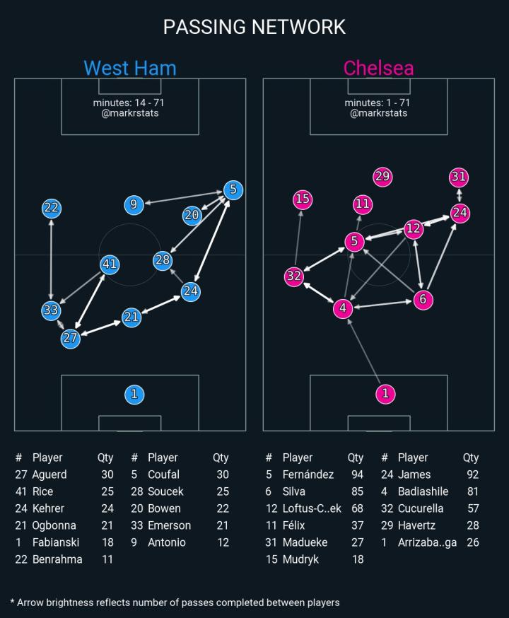 尤其是在西汉姆联两名中场使用了赖斯和帕奎塔先发之后,开局将近三十分钟的时间里西汉姆联中后场的空间多次被切尔西利用。恩佐和菲利克斯在中场的活动是切尔西进攻的关键,前者更是本场切尔西在进攻端输出最高的存在。