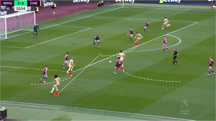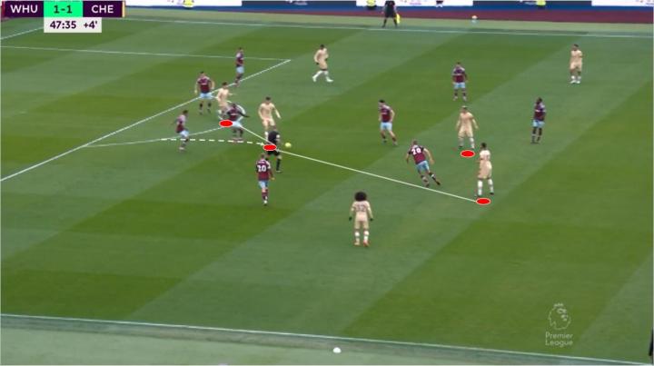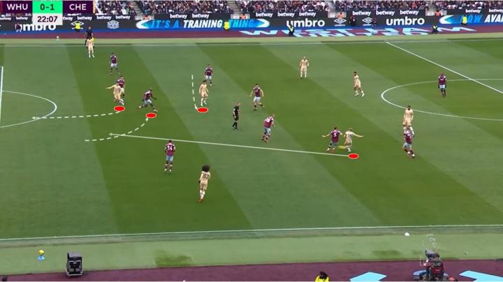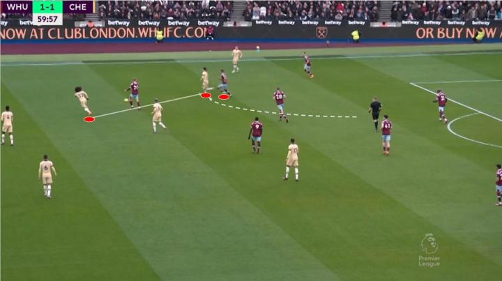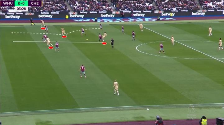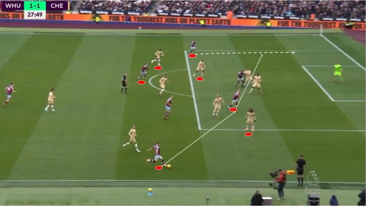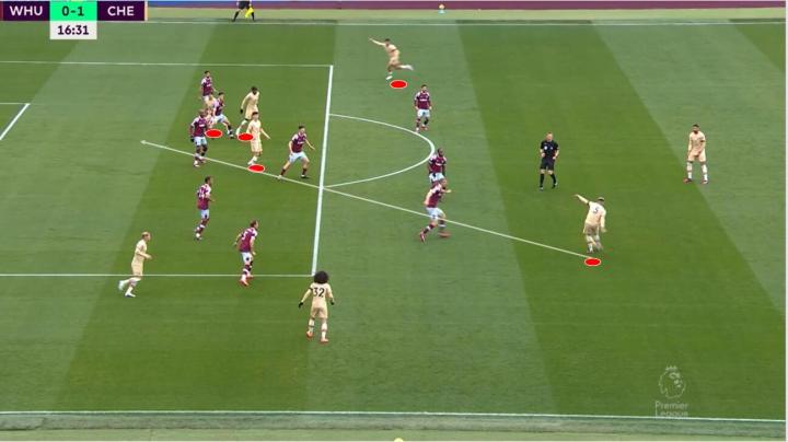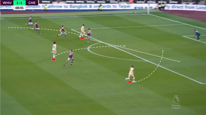 同时这次切尔西在局部有三名进攻球员,西汉姆联想要完成局部盯人是很难的,远端还有套上的里斯·詹姆斯。