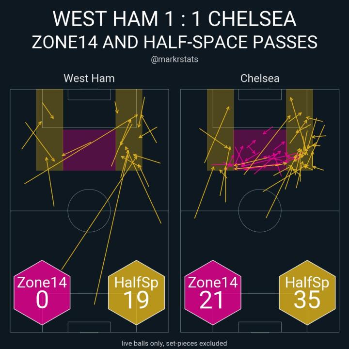 除去开场后三十分钟内切尔西大量的跑轰打了西汉姆联措手不及外,当西汉姆联开始压缩后腰和中卫之间的空间,在中路上强度后,切尔西的威胁进攻基本消失了。