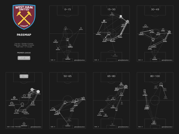 从站位图上也能看出,西汉姆联的三名中卫站位非常低,同时身前的赖斯与他们的距离保持非常好,在中轴线形成高硬度高强度的防守体系。