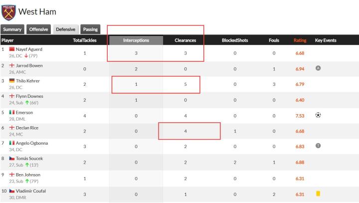 中卫阿格尔德贡献3次拦截3次解围,中卫科雷尔贡献5次解围,后腰赖斯也有4次解围入账。