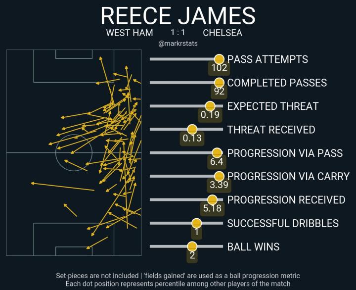 切尔西两名边后卫库库雷利亚和里斯·詹姆斯都是助攻能力很不错的边后卫,但是受制于球队整体打法,里斯·詹姆斯本场的表现相较于曾经的自己而言,并不算非常出色。