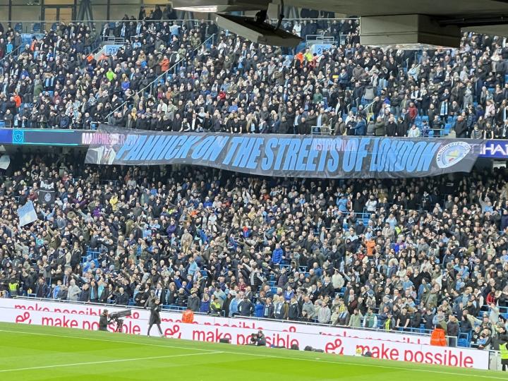 另一场横幅上印着曼城聘请的律师潘尼克的照片,写着:“潘尼克在伦敦街头”,可能以谐音暗指:伦敦街上蔓延着恐惧(Panic on the street of London)。