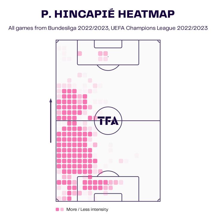 在球场左侧有大量的拦截和防守动作,因卡皮耶的平均防守范围从自己的禁区一直延伸到对手半场几码。