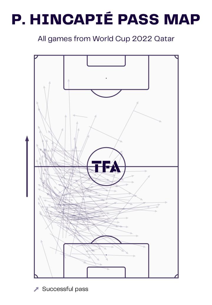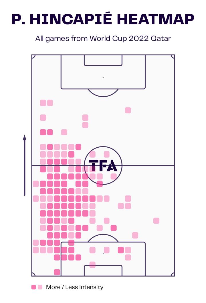 因卡皮耶无疑是厄瓜多尔在世界杯上的一名关键球员。古斯塔沃·阿尔法罗信任这名德甲后卫进入到对方防线,找到前场的进攻球员,这从他在卡塔尔的传球示意图中可以看出。