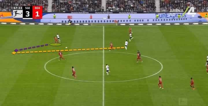 上图中,法兰克福的中锋在因卡皮耶的一侧加速前插。尽管如此,这名20岁的球员还是设法跟上了这名前锋,并在射门前进行了一次英勇的铲球,避免了危险。