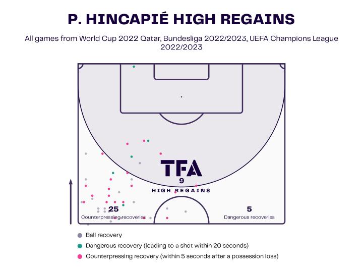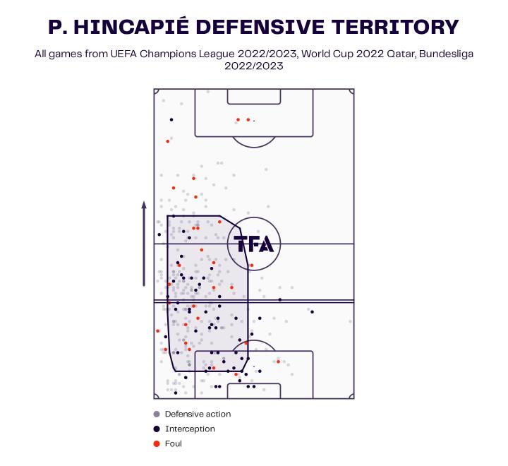 因卡皮耶不仅能够很好地覆盖球场的深度,因为他的速度,这名防守球员也非常擅长防守横向区域。这一点在厄瓜多尔的防守区域图上很明显: